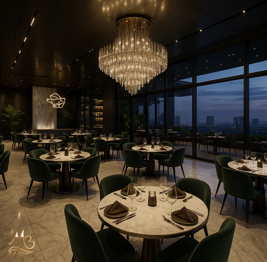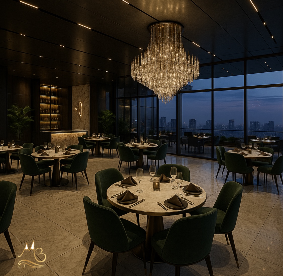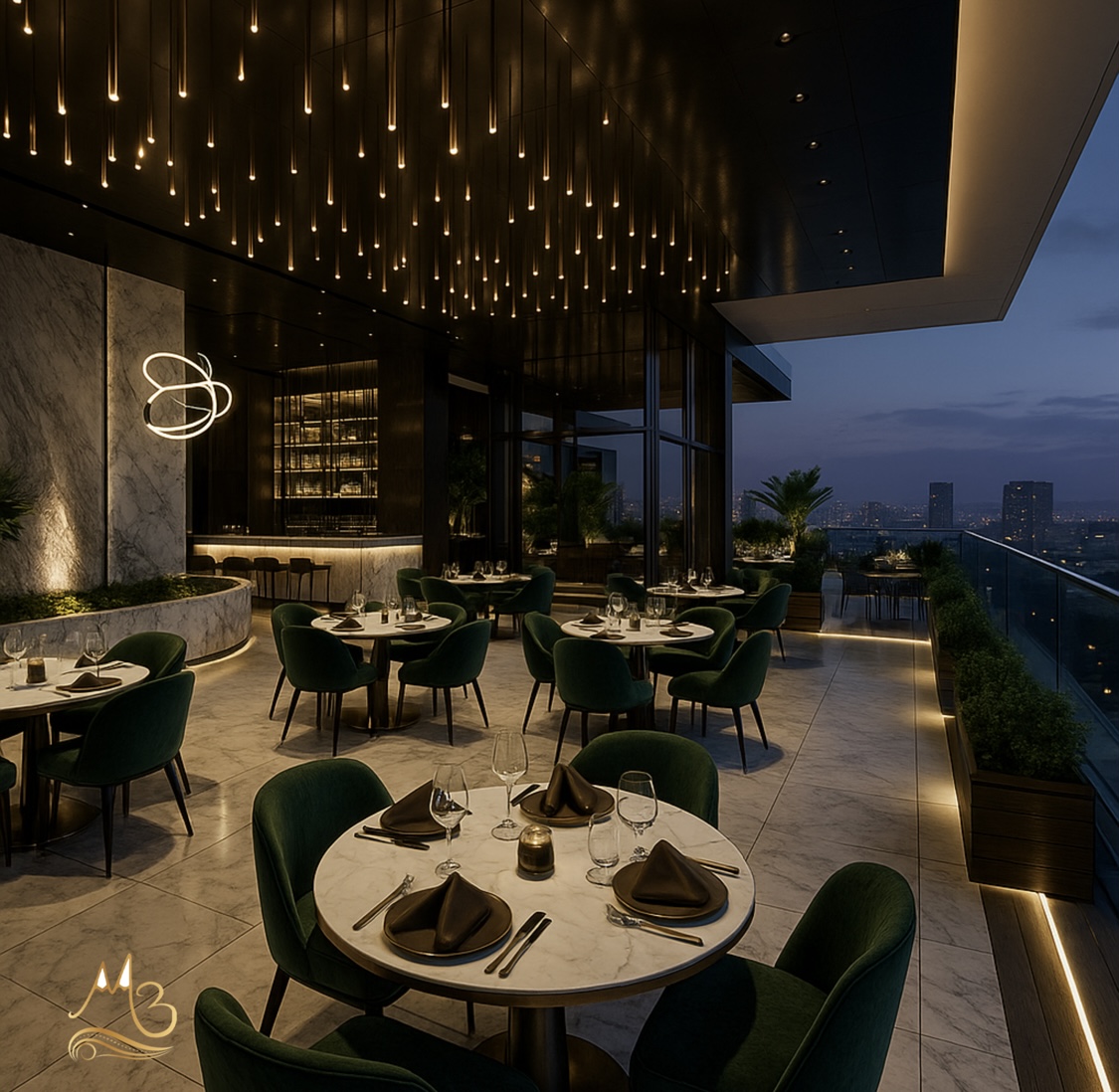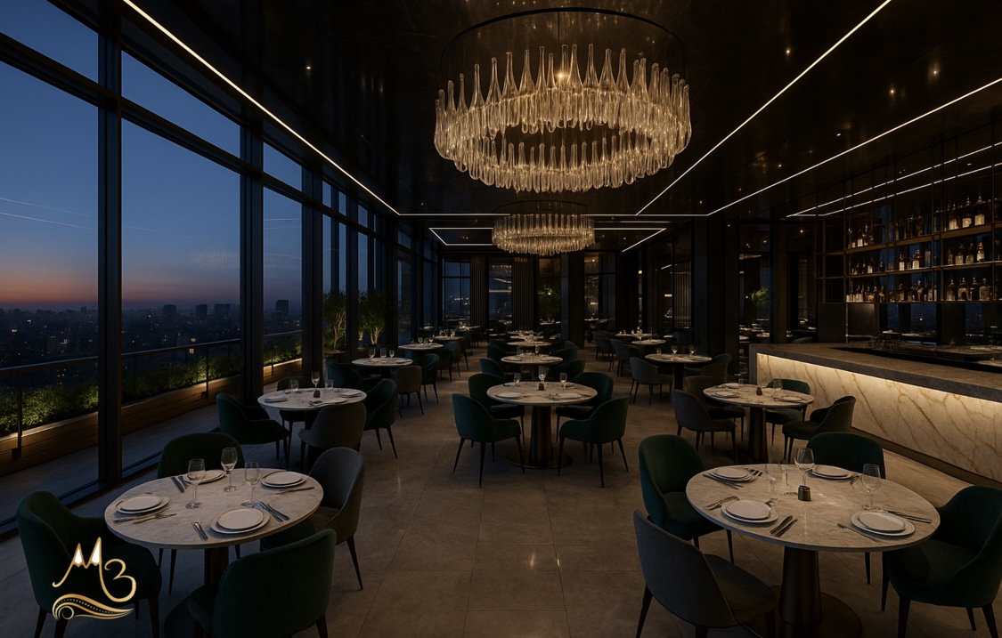 اين رستوران ٥٠٠ متري در طبقه پنجم طراحي شده و تركيبي از سبك مدرن لاكچري با فضاي باز شهري را ارائه مي دهد.